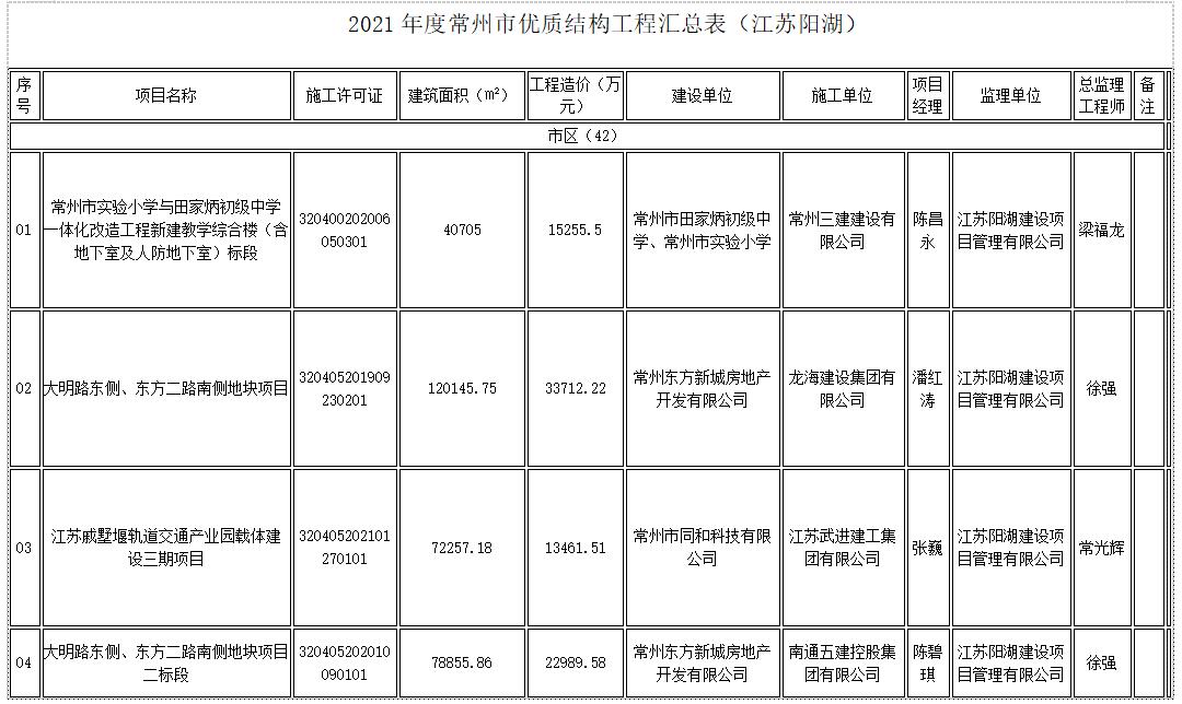 通過相關(guān)項目員工的共同努力,經(jīng)評審,我陽湖公司有9個項目榮獲2021年度常州市優(yōu)質(zhì)結(jié)構(gòu)工程榮譽,希再接再厲,爭取更大成就。具體項目如下: